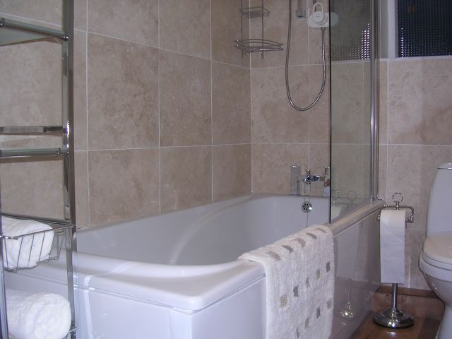 The bathroom has a shower over the bath, plenty of shelving space, a large mirror and travertine tiles.